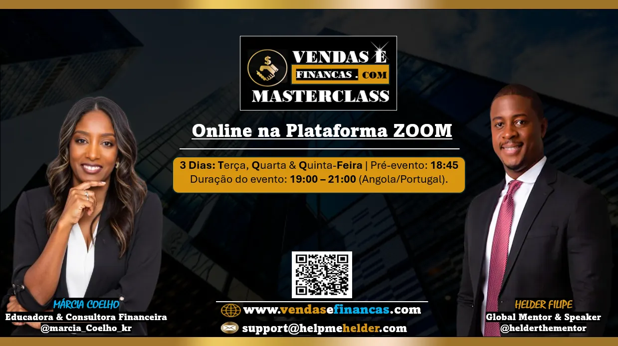 Este evento exclusivo de alto nível online "VENDAS & FINANÇAS MASTERCLASS" poderá fazer potencialmente toda a diferença na sua carreira e/ou negócio, pois aprenderá estratégias que funcionam nos dias de hoje a nível internacional para desbloquear a sua mentalidade, as suas Vendas & Negociações, assim como também aprenderá como Gerir & Multiplicar as suas Finanças como se calhar nunca antes conseguiu. Clique no botão abaixo para saber mais!