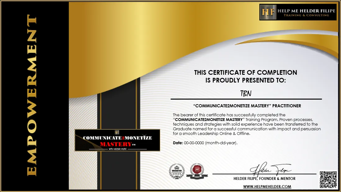You'll get a full year's access to Helder's move-by-move process to Communicate2Monetize your life Experience / Skills and really make profits; Communicate your True Value, Your Worth or your offers confidently and Close new clients into your business quickly. You will have the Exclusive Opportunity to Join One of the best Communities on Earth, who will support and help you truthfully from the Heart, Hold you accountable to take action and build / scale your business &/or Career, even if you're just getting started in your business / career, YOU WILL BE EMPOWERED TO BE UNSTOPPABLE.